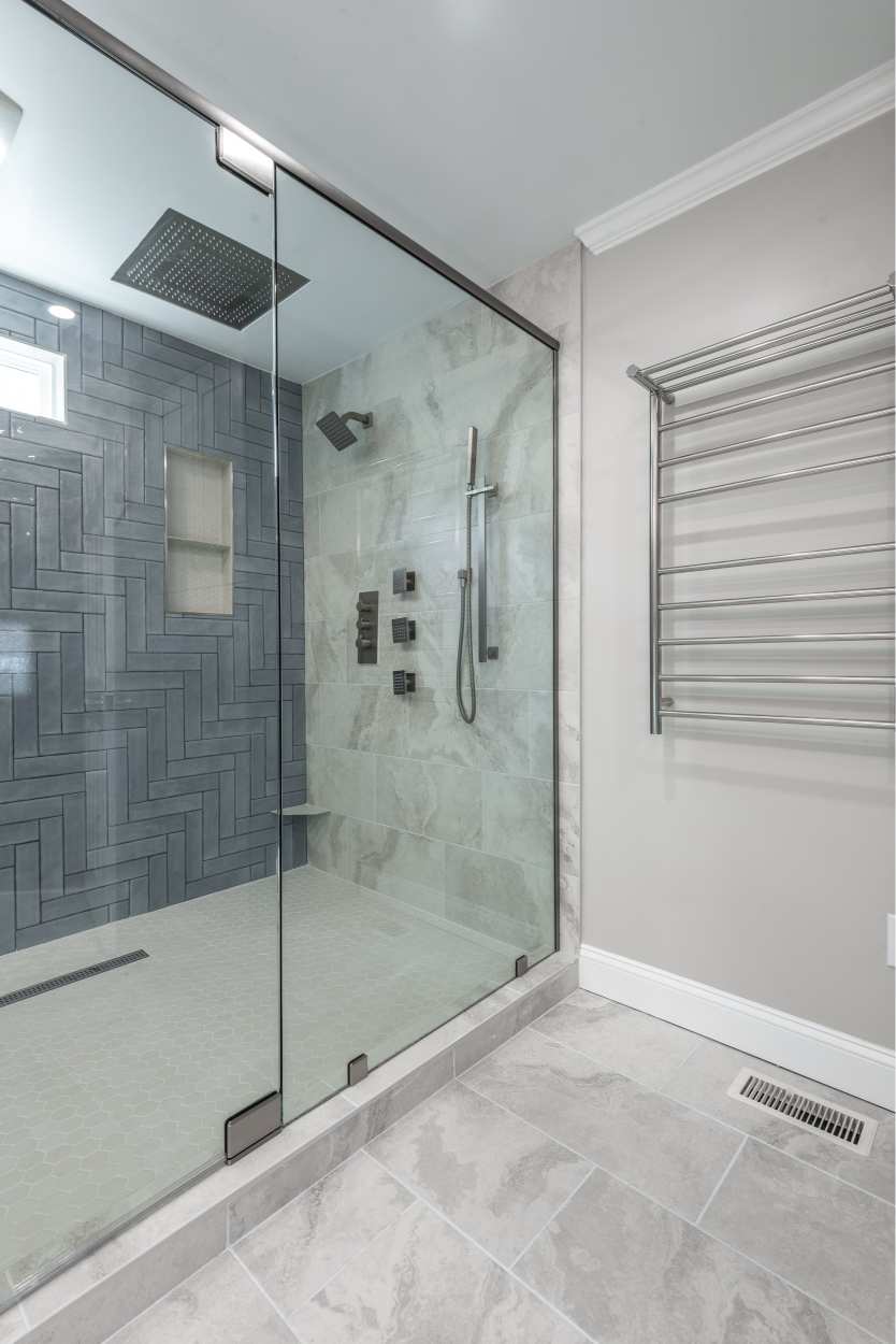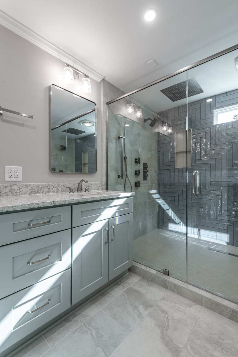 This homeowner found us after reading our reviews and wanted something truly custom. We completely gutted the space down to the studs, reimagined the entire layout, and built it back with a design that blends elegance and function. From the double vanity to the massive walk-in shower with rainfall heads and striking herringbone tile, every detail was crafted to stand out. Big shoutout to Hestia Designs for creating a one-of-a-kind plan that set the stage for this transformation.